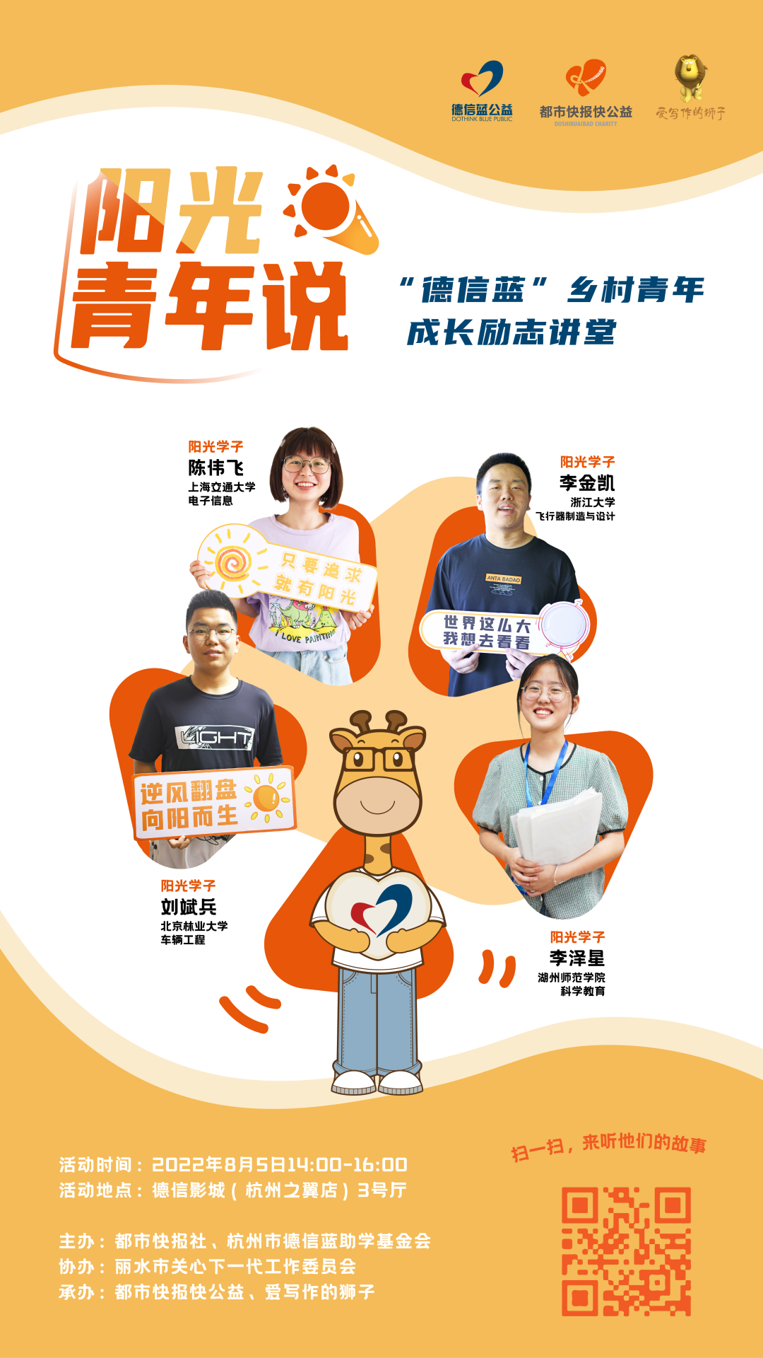 这周五,2022都市快报阳光助学行动衍生项目“阳光青年说·‘开体育app官网入口网页蓝’乡村青年成长励志讲堂”即将开讲。丽水缙云学子李金凯、青田学子刘斌兵、庆元学子陈伟飞和衢州龙游学子李泽星4位阳光青年将在现场讲述自己的故事。