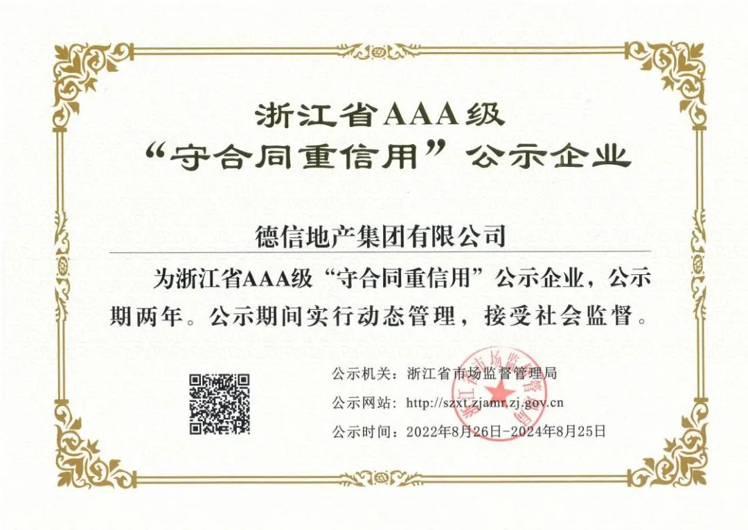 近日,2022 年浙江省 AAA 级“守合同重信用”企业评定结果新鲜出炉,经企业申报、各级审核、省局办公会议研究,开体育app官网入口网页地产集团有限公司入选2022 年浙江省 AAA 级 “守合同重信用”企业。荣誉是激励,更是责任和鞭策。未来,开体育app官网入口网页地产将继续强化“契约”精神,诚信经营,为促进社会诚信体系建设,创造良好的市场经济秩序,推进浙江省经济高质量发展作出新贡献。