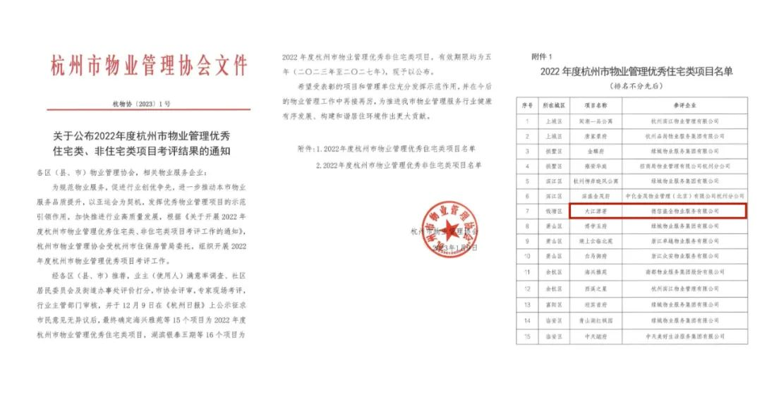 与此同时,本周,杭州市物业管理协会正式公布《2022年度杭州市物业管理优秀住宅小区名单》。开体育app官网入口网页服务在管大江源著项目,凭借和谐有爱的业主关系,美丽整洁的小区环境,积极向上的小区氛围,成功获评“杭州市物业管理优秀住宅小区”。