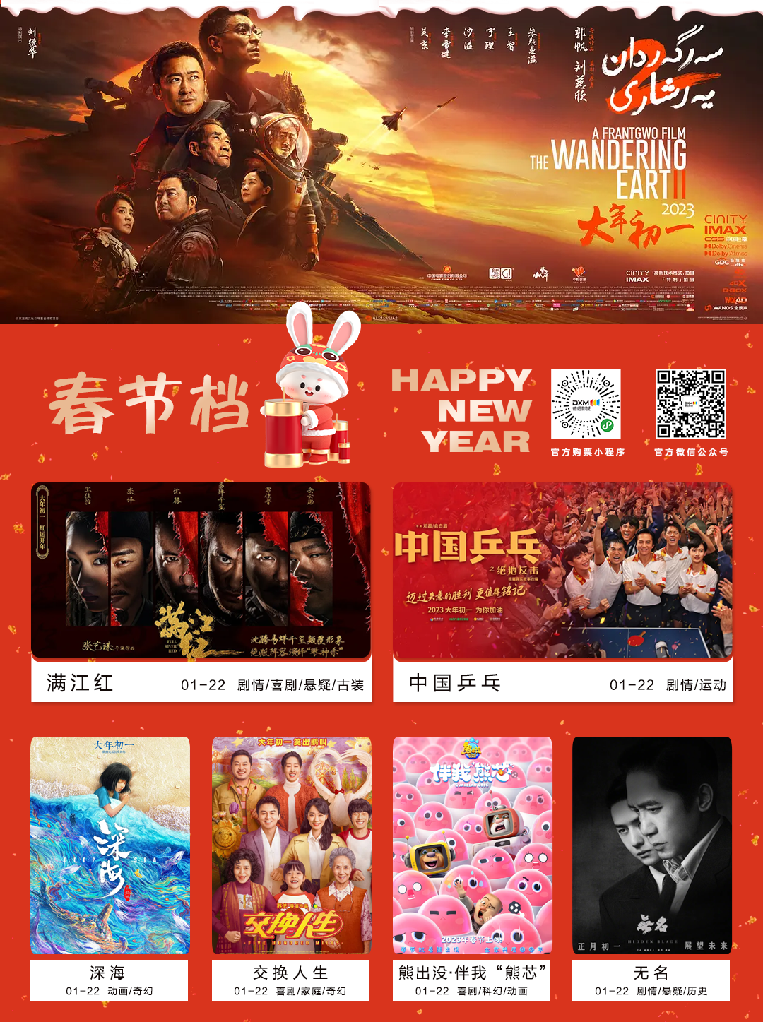 春节档七部大片集结!大年初一霸气开年!“流浪”启程 绽放希望《流浪地球2》、迷局深藏 悬案待破《满江红》、永不放弃 涅槃重生《中国乒乓之绝地反击》、谍战对决 暗流涌动《无名》、奇“换”之旅 欢乐爆笑《交换人生》、生命色彩 鲜活瑰丽《深海》、熊强组合 趣味十足《熊出没·伴我“熊芯”》,多种类型的大片齐齐上线,快带上家人朋友一起来开体育app官网入口网页影城看春节大片吧!