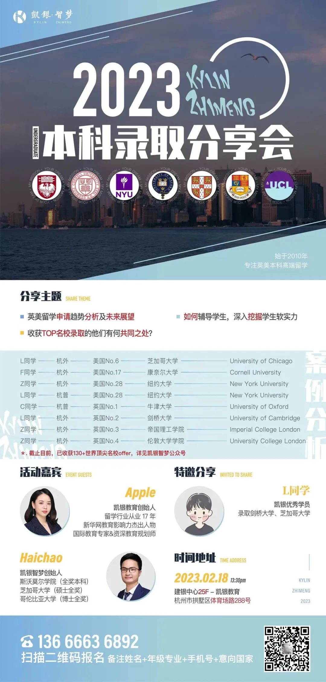 “2023凯银智梦本科录取分享会”将于2月18日(本周六)重磅来袭,会上不仅有哥大博士与你独家分享英美留学新趋势,名师在线解读申请难点,更有学员收获Top名校录取秘籍全公开!需要报名小伙伴的赶快扫码咨询哦~